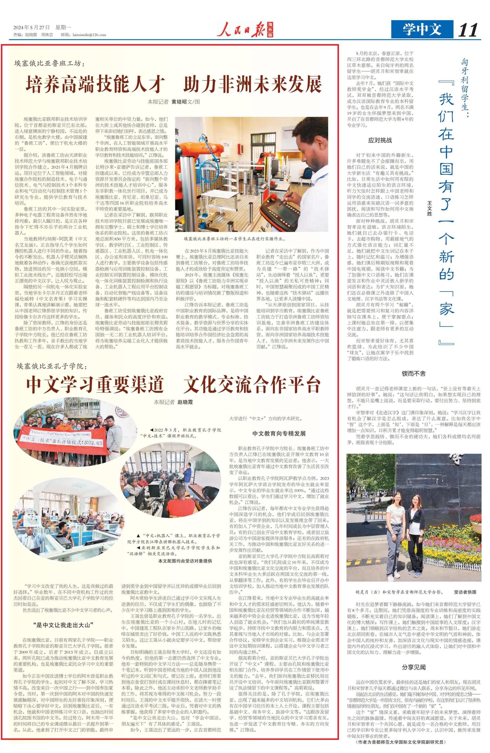 《人民日报》整版报道埃塞俄比亚鲁班工坊、孔子学院培养高端技能人才 搭建文化交流合作平台 助力非洲未来发展
