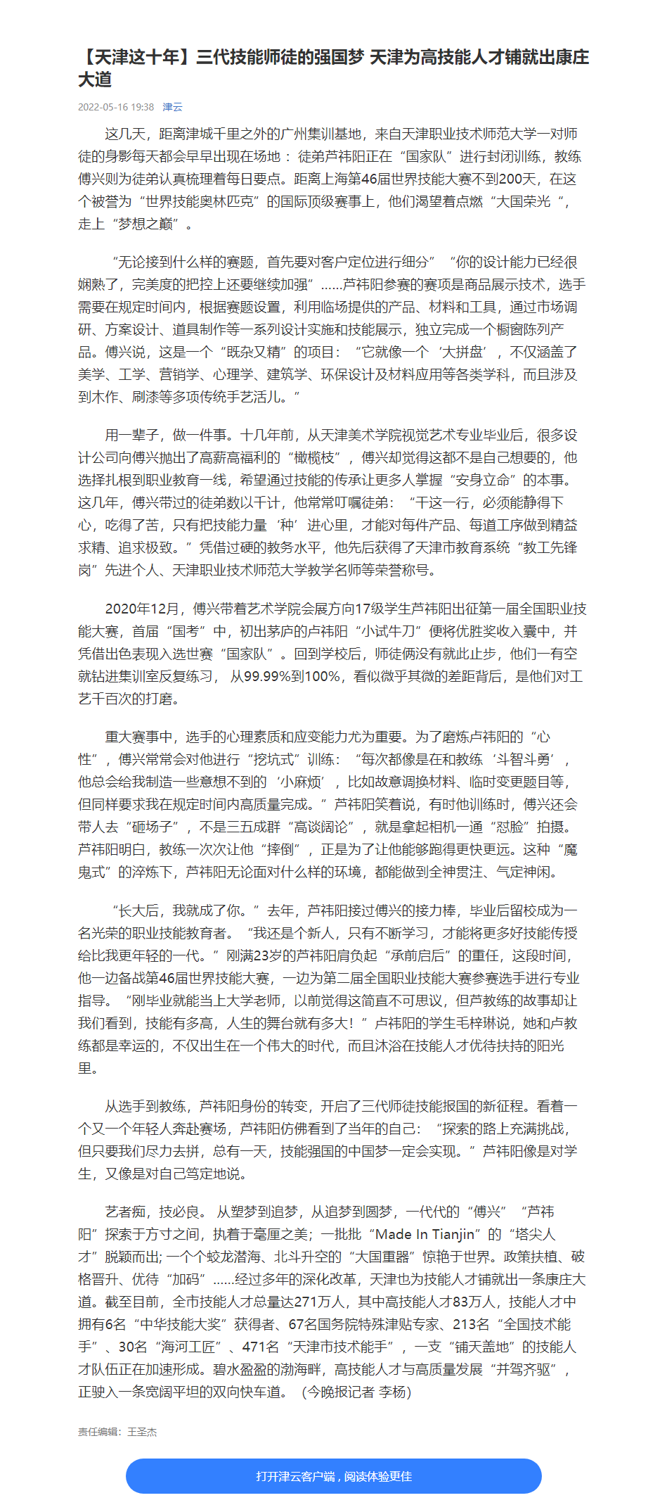 今日津云“天津那10年”博栏以“3代技巧师徒的强邦梦 天津为下技巧人材展便出平坦大路”报导艺术教院副院少傅兴率领第46届寰球技巧年夜赛商品映现技能名目邦家散训队选脚、艺术教院教员芦祎阳交战齐邦战宇宙技巧赛场,传启做事技巧教导交力棒的拼搏小说。
